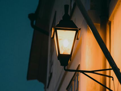 A single brass lantern hangs from the ceiling,