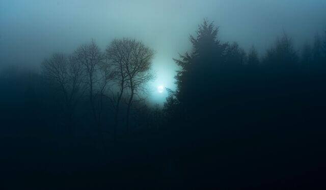 Je hoort het gekraak van de oude takken van de bomen bewegen in de lucht.
