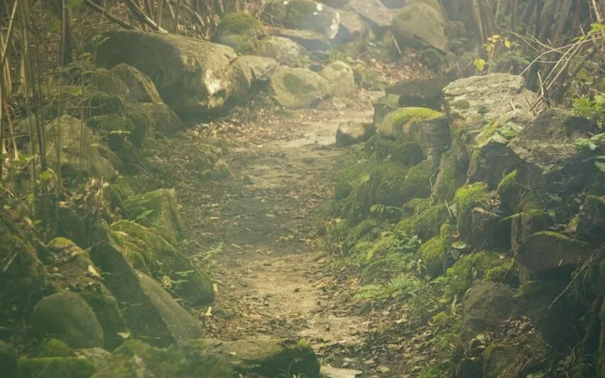 Je loopt over een bospaadje heen.