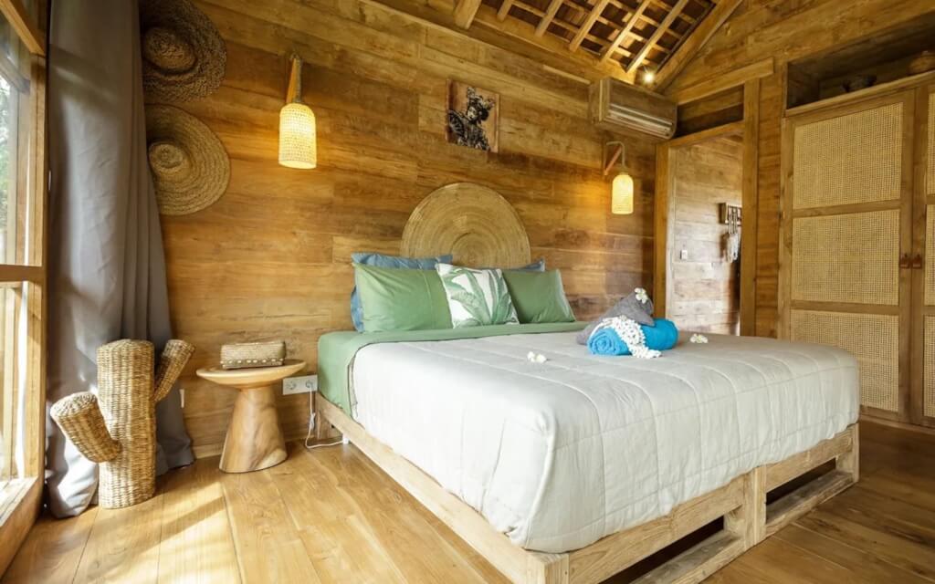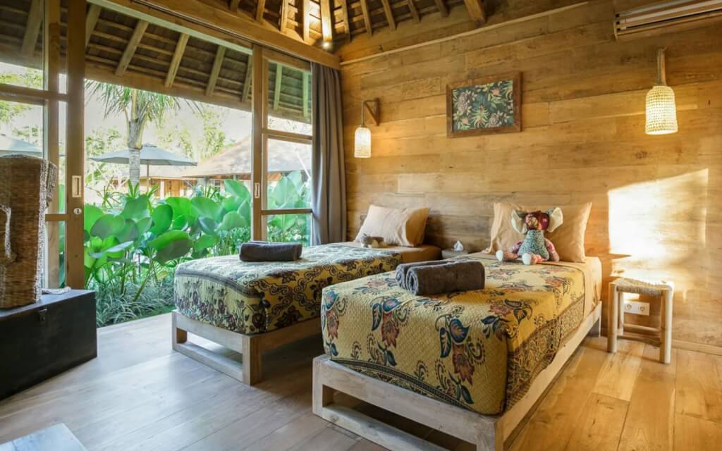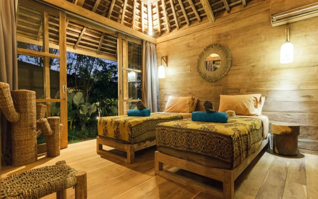 Bingin Retreat is a stunning eco-inspired luxury estate hidden away in the hills, clifftops and white sand beaches of Bukit Peninsula in the southern tip of Bali. This amazing 12-bedroom eco-lodge is a 10-minute walk to Bingin Beach, a famous surf spot, and it features traditional Javanese Joglo houses crafted out of recycled teak wood. The garden is expansive, featuring a yoga bale and a magnificent flower-shaped swimming pool. The venue is made up of 6 cabins or bungalows. Each bungalow has 2 bedrooms (one a little bigger, one a little smaller) and 1 bathroom to share. Single-room bungalows will have 2 people to 1 bathroom, while double-room bungalows will have up to 4 people to 1 bathroom. Rooms are spacious and breezy, have air-conditioning, and double rooms can be fitted to have 2 separate beds. Rooms will be assigned on a first-come, first-serve basis.