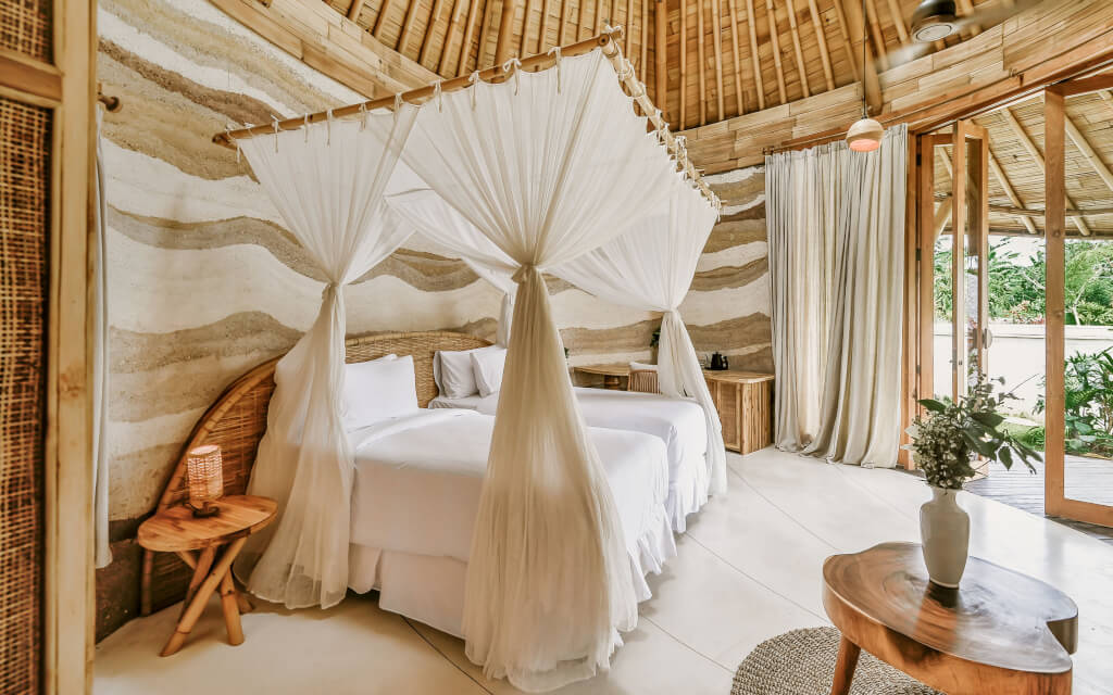JUNGLE SUITE: Eco-luxury suites in a private jungle setting. Rooms can be booked as PRIVATE (one person) or SHARED (two people) and can be configured with ONE KING bed or TWO TWIN beds. Each suite has a private bathroom, shower, and tub. Your private balcony overlooks unobstructed views of the jungle with river and waterfall below.