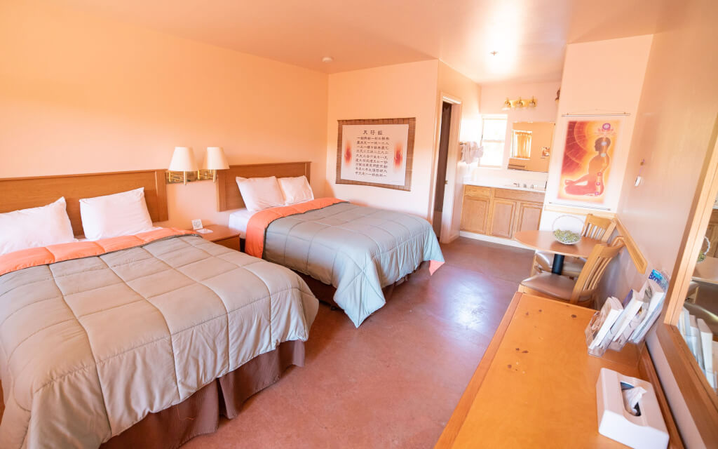 Guests stay in simple, comfortable casitas nestled in nature, designed to support rest, reflection, and healing. Each room includes a private bathroom, serene desert views, and easy access to walking trails, meditation spaces, and healing gardens. You may choose between a shared or private room, depending on your preference for solitude or connection. The atmosphere is quiet, grounding, and intentionally free from distractions—ideal for deep inner work.