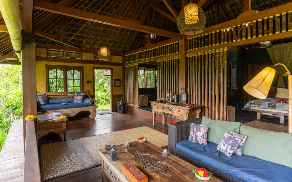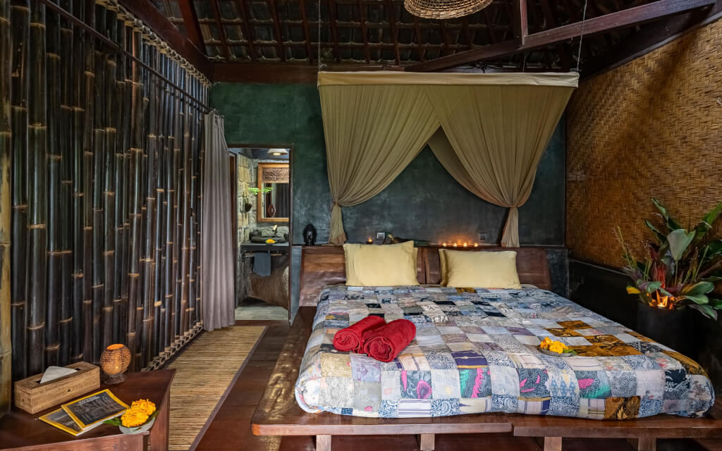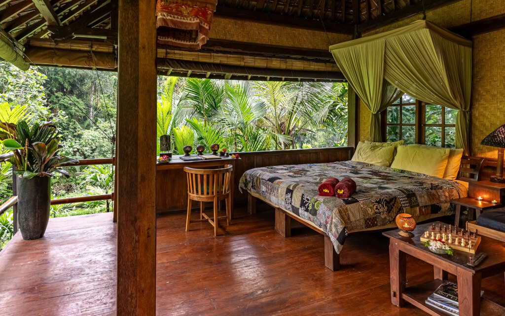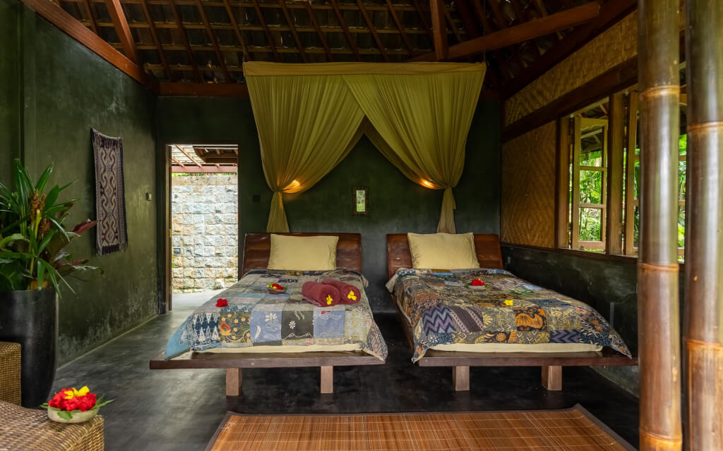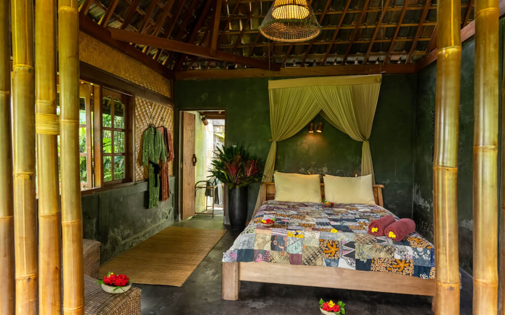 Bali Eco Stay is a sustainable resort in the heart of Bali. This green sanctuary sits among the lush landscapes of the Balinese jungle. With rice fields and terraces stretching endlessly, charming villages steeped in local customs, pristine forests, & ancient temples beneath the coconut-covered slopes of Mt. Batukaru, you’ll have the chance to reconnect with nature & enjoy an intimate reunion with Mother Earth. There’s no traffic, nor city noise, and none of the bustling clamor of Bali’s tourist hubs. In this peaceful oasis, you’ll bask in the sounds of waterfalls outside your rice water bungalow, the rhythmic symphony of jungle insects, and the breeze rustling through coconut trees. Your stay is an opportunity to recharge and detox deeply. Everything you consume is grown on-site, using organic, sustainable practices, lovingly harvested before each meal. The water, as pure as the food, comes directly from a spring & is further filtered. Even your skin will be treated with care, as the shower gels, shampoos, & insect repellents are made from the natural goodness of the land. When you wake up, you’ll realize this is not a dream, but rather that you have arrived at last.