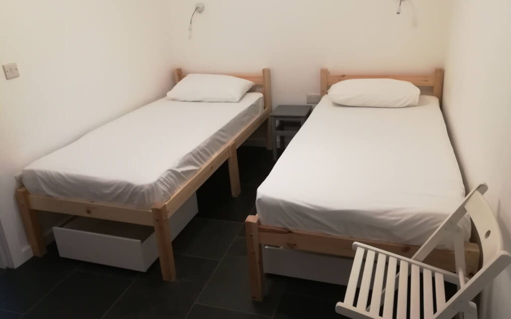 Bunk barn with single beds in shared rooms of 2-4 people and shared bathrooms. Towels and bedding can be provided by arrangement with the owners of the barn (the current cost for this is £8), let us know if this is something you would like, or you are welcome to bring your duvet and towel: pillow and undersheet are already on the beds. There is one large wash room with basins, shower cubicles, and toilets for all guests.