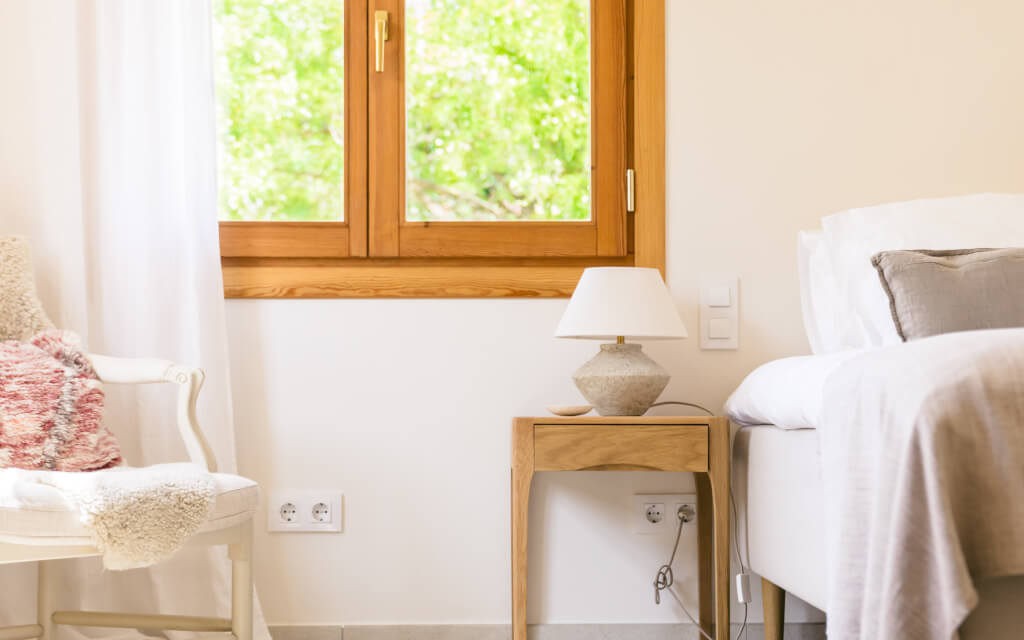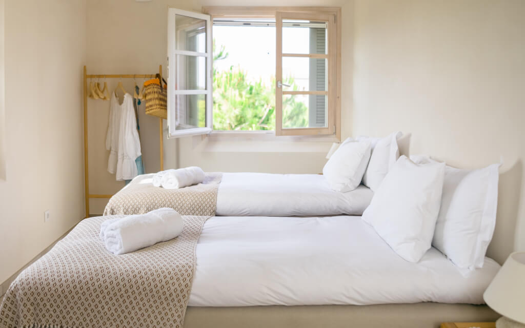 Accommodation is held within the peaceful setting of Sadhana House, offering comfortable Mediterranean–Nordic style rooms designed for rest and relaxation. Each room includes a private bathroom, air conditioning, underfloor heating and WiFi, with access to a light-filled yoga shala, communal kitchen and tranquil shared spaces surrounded by nature. Guests can choose between shared or single rooms in a calm, supportive retreat environment.