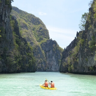 Walk to the water's edge and climb into the boat.
