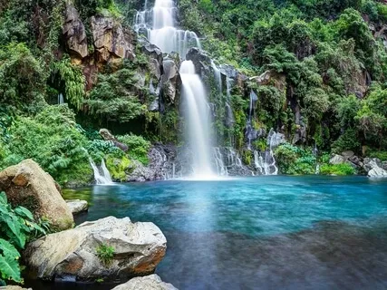 Wo ein herrlicher heilender Wasserfall von hohen Felsen aus schwarzem Tourmalin hinunterfließt in ein Becken von türkis Wasser.