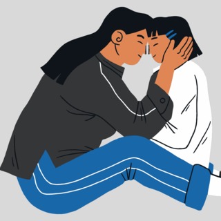 While softly resting your hands on his or her shoulders,