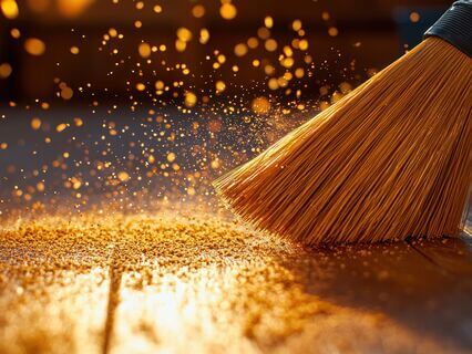 The soft scrape of the broom against the floor feels rhythmic and grounding,