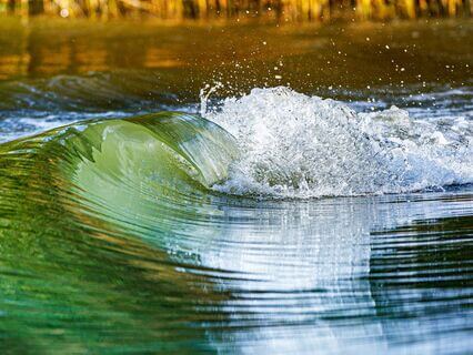 The wave crashes,